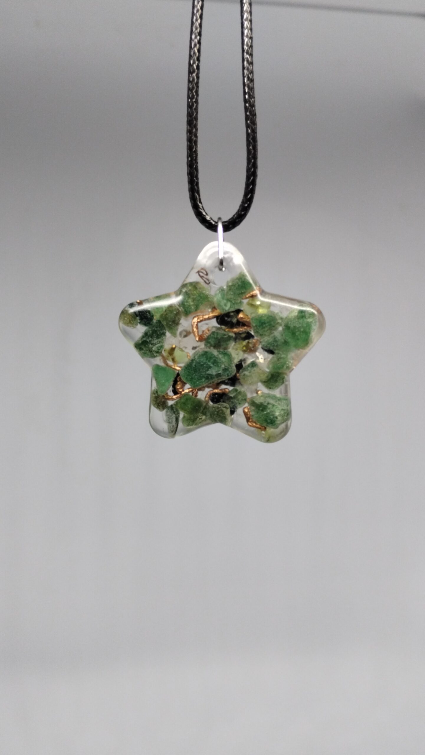 Pendentif Orgonite unique Étoile (Aventurine verte, Cristal de roche, Péridot, Tourmaline Noire) crée par mes soins.