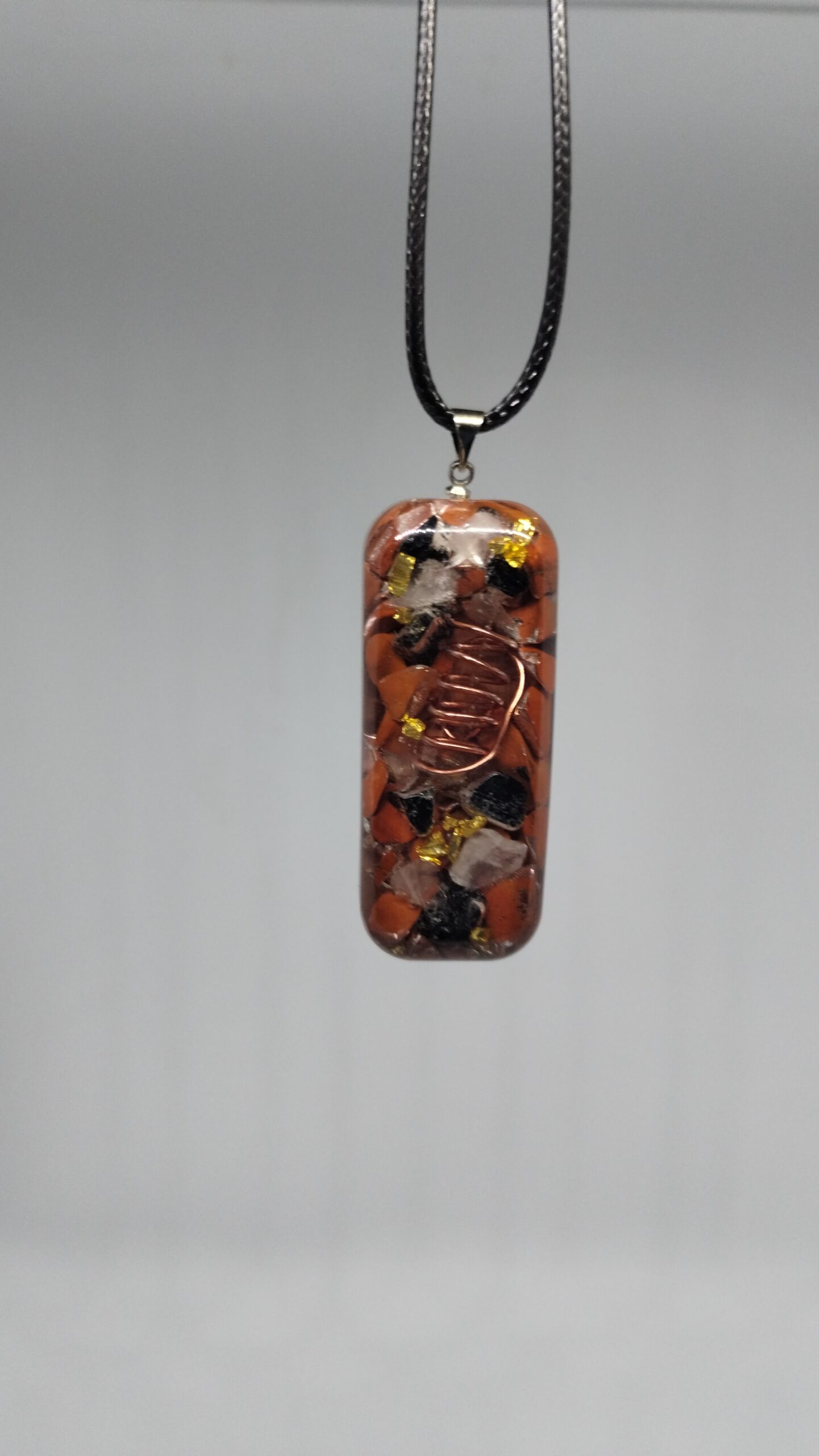 Pendentif Orgonite unique (Jaspe rouge, Cristal de roche, Quartz rose, Tourmaline Noire) crée par mes soins.
