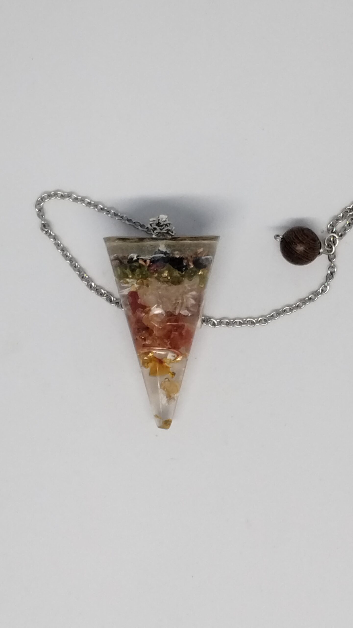Pendule en Orgonite : Cornaline, Cristal de roche, Quartz rose, Péridot, tourmaline noire.